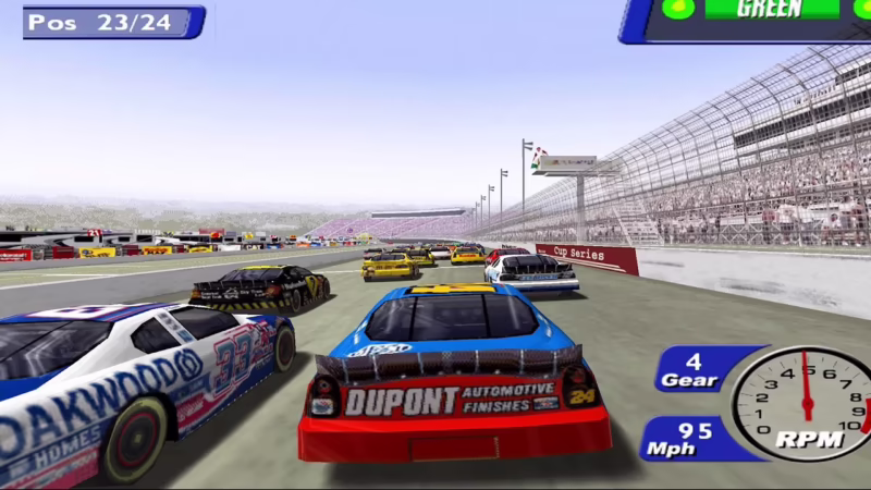 Pero el detalle no se detenía en los vehículos. Los 19 circuitos de la Winston Cup cobraban vida con fondos repletos de aficionados, gradas imponentes, vehículos recreativos y edificios. El equipo de pits estaba listo para la acción, y los efectos visuales, como el humo que emanaba de los neumáticos al quemar goma, añadían una capa extra de inmersión. Gráficamente, el juego era limpio y pulido, evitando en gran medida los problemas de parpadeo y bordes dentados (aliasing) que plagaban a muchos de los primeros títulos de PS2.