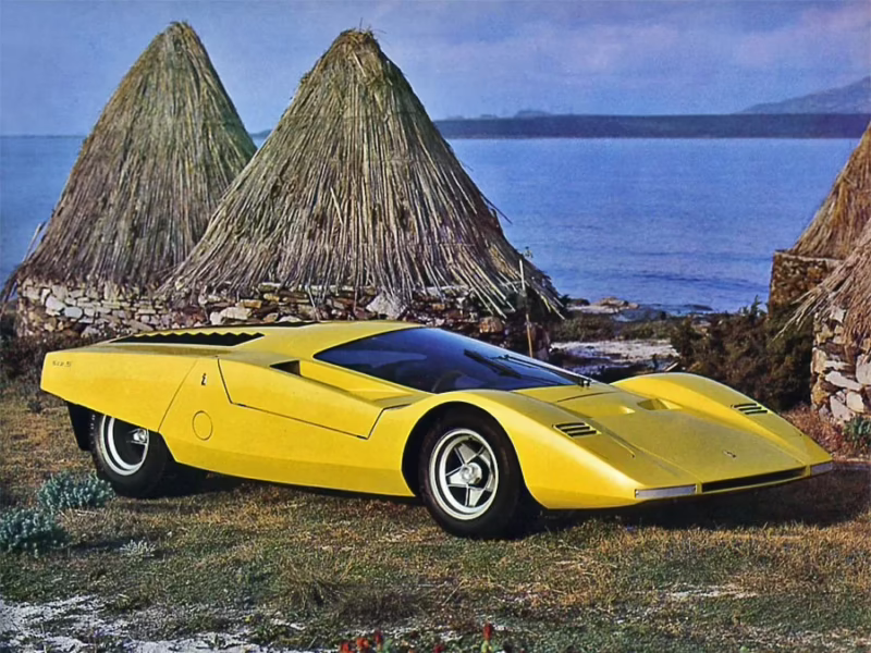 La silueta del coche es dramática desde cualquier ángulo. El parabrisas, muy inclinado, se fusiona casi sin interrupción con el capó delantero y el techo, creando una cabina que recuerda a la de un avión de combate. Las puertas no eran convencionales; en su lugar, todo el conjunto del techo y el parabrisas se abatía hacia adelante para permitir el acceso, una solución espectacular que enfatizaba su carácter de prototipo. Los faros, ocultos bajo paneles que se deslizaban, mantenían la pureza aerodinámica de la parte frontal cuando no estaban en uso. Cada línea, cada curva, cada detalle estaba pensado para cortar el viento y para impresionar.