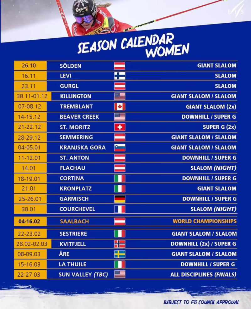 El programa actual incluye cinco disciplinas individuales (Descenso, Super-G, Eslalon Gigante, Eslalon y Combinada Alpina) y un evento por Equipos Mixto.