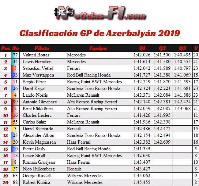 Valtteri Bottas lidera la victoria doble de Mercedes en Bakú Valtteri Bottas ganó un Gran Premio de Azerbaiyán inusualmente tranquilo por delante de su compañero de equipo en Mercedes, Lewis Hamilton, ya que las 51 vueltas transcurrieron sin un incidente importante.