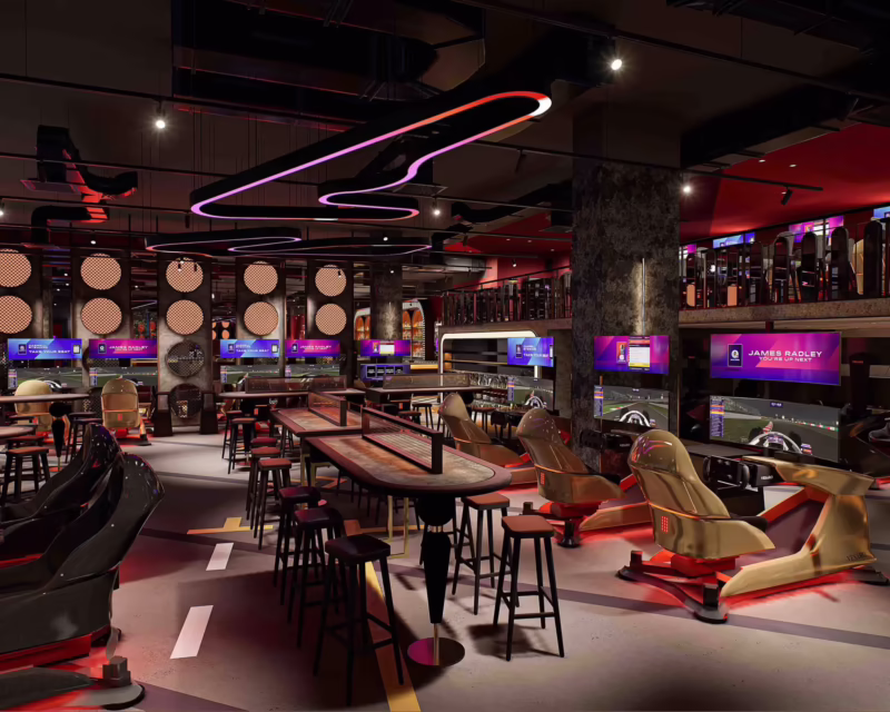 Olvídate de las gradas y los paddocks. F1 Arcade es un concepto diferente, un lugar donde el espectador se convierte en protagonista. Se trata de un centro de entretenimiento experiencial de primer nivel que combina la emoción de las carreras de simulación con una oferta de hospitalidad de alta gama en una atmósfera electrizante. El local de Boston Seaport es una imponente estructura de casi 1,500 metros cuadrados distribuidos en dos plantas, diseñada meticulosamente para sumergir a cada visitante en el mundo de la Fórmula 1.