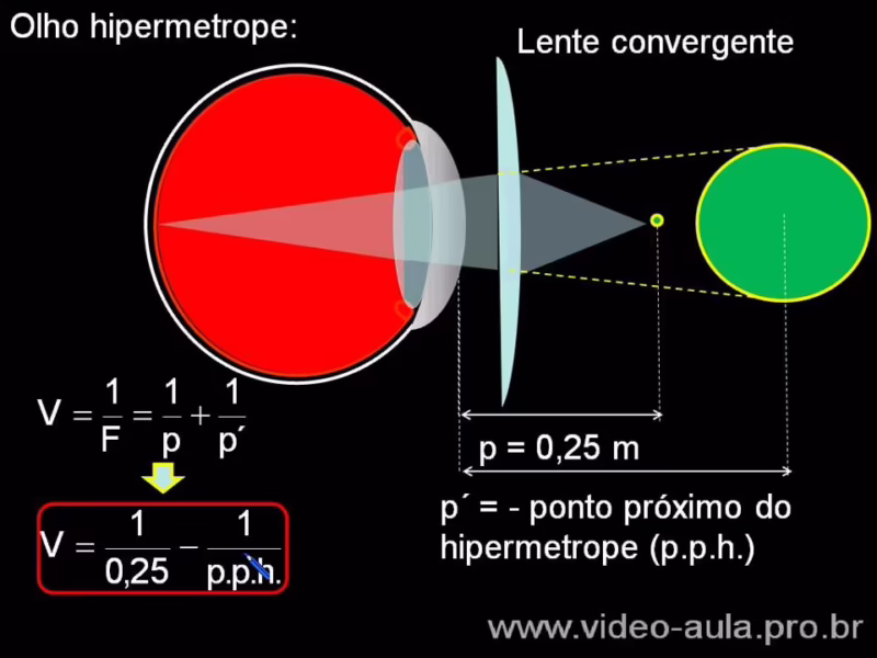 La hipermetropía, o hipermetropía, es una afección en la que el punto cercano del ojo está más lejos de lo normal. Para corregirla, se utiliza una lente convergente (de potencia positiva). La potencia de la lente necesaria para corregir la hipermetropía se puede calcular mediante la fórmula de la lente: P = f1, donde f es la distancia focal en metros.